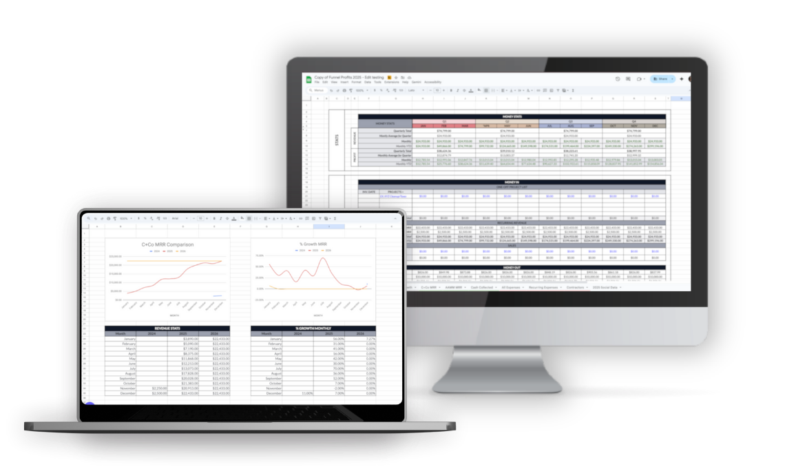 comprehensive financial forecasting and profit-tracking spreadsheet covering metrics like MRR, profit, expense breakdowns, contractor costs, recurring expenses, and YoY growth